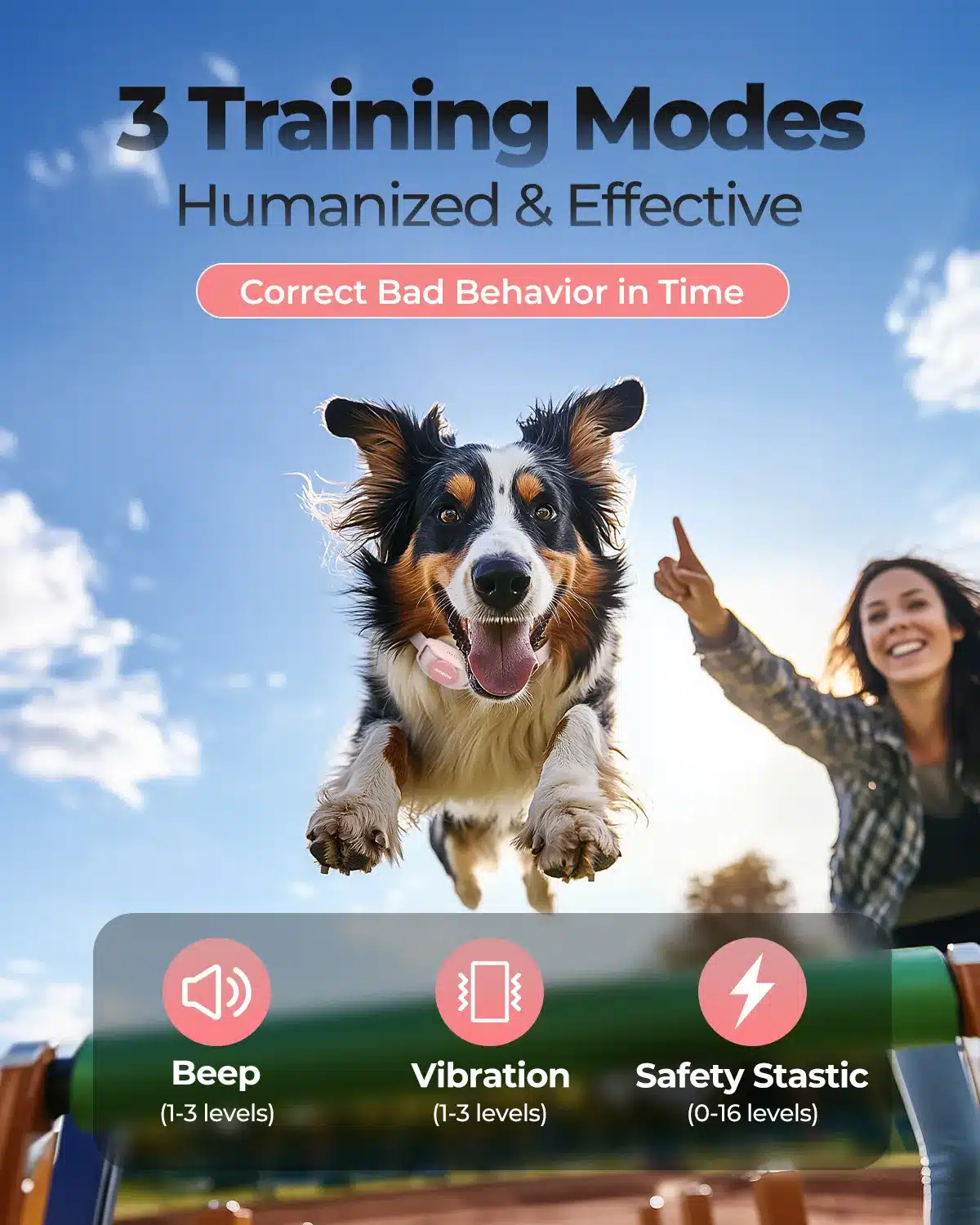 Beep (1–3 levels) Vibration (1–3 levels) Safe Static Shock (0–16 levels) The collar remembers your last setting for seamless training each time.