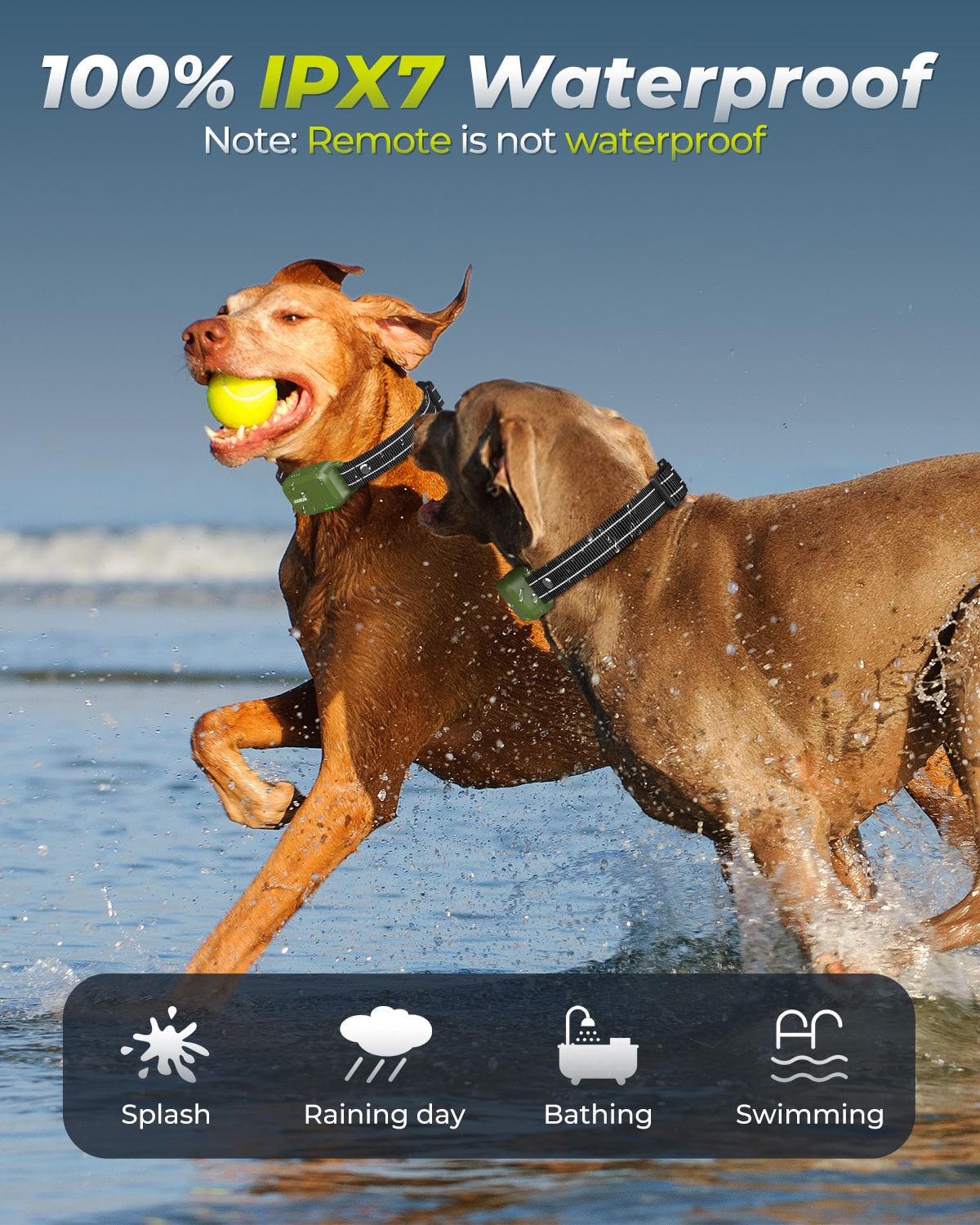 IPX7 waterproof collar ensures training continues, rain or shine.