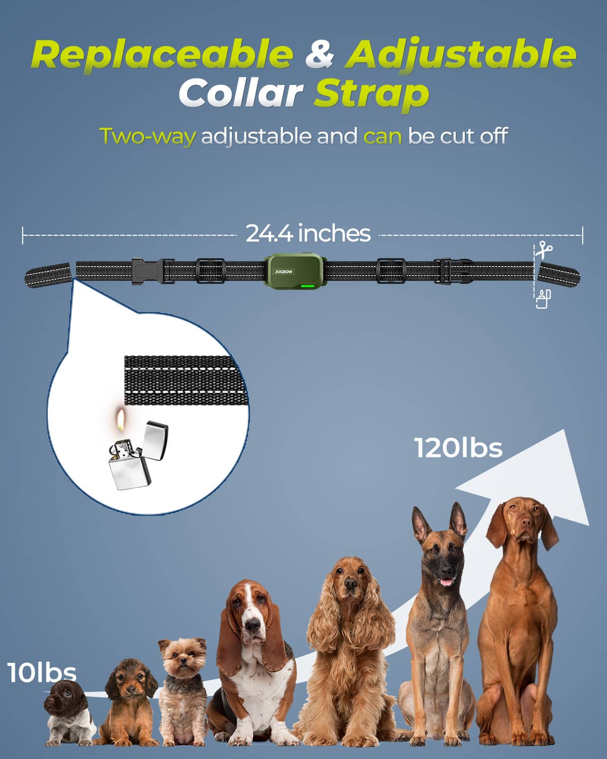 Adjustable collar fits necks 7.8-24.4 inches for dogs of all breeds.