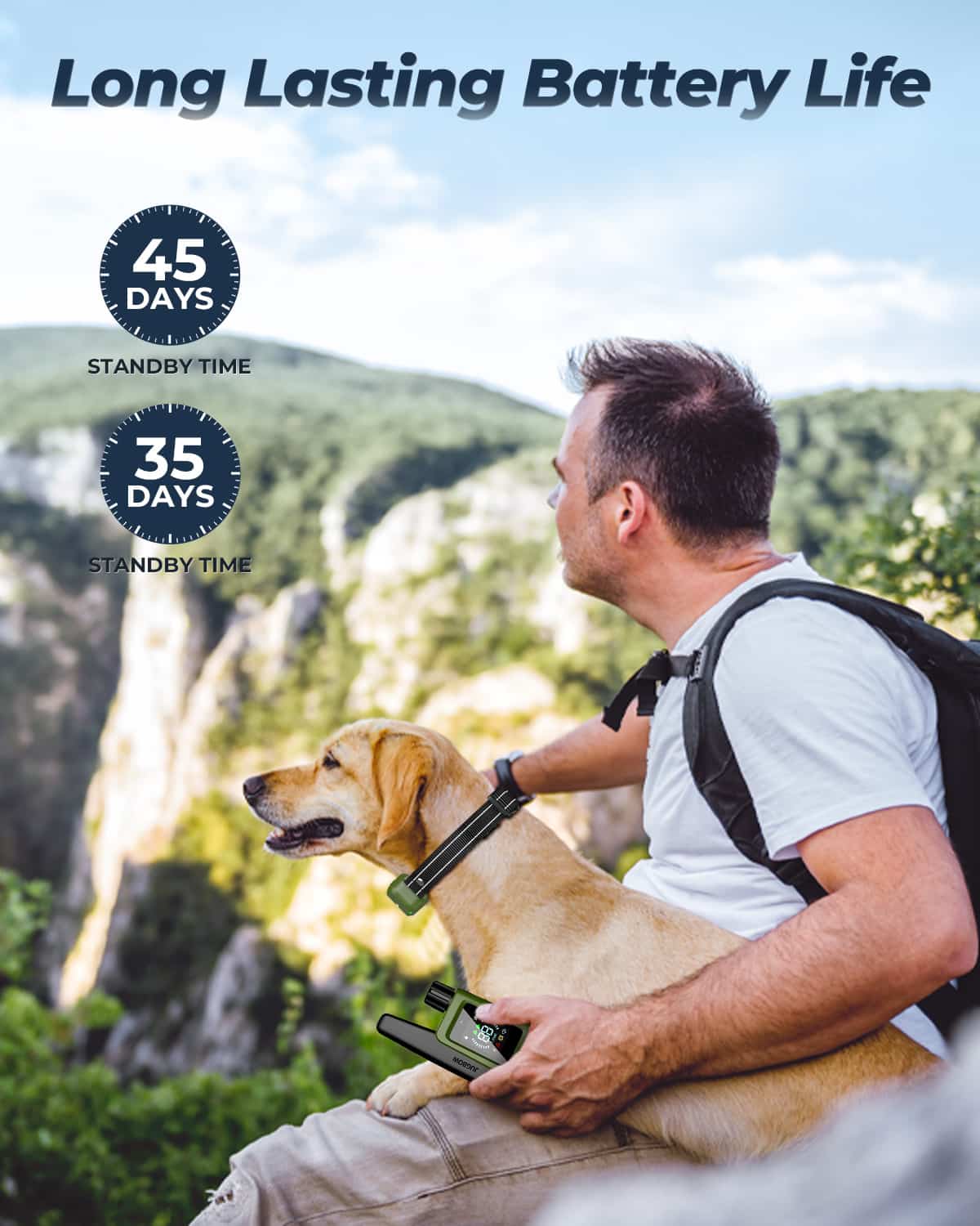 35-day standby for the collar and 45-day remote standby ensures uninterrupted sessions.